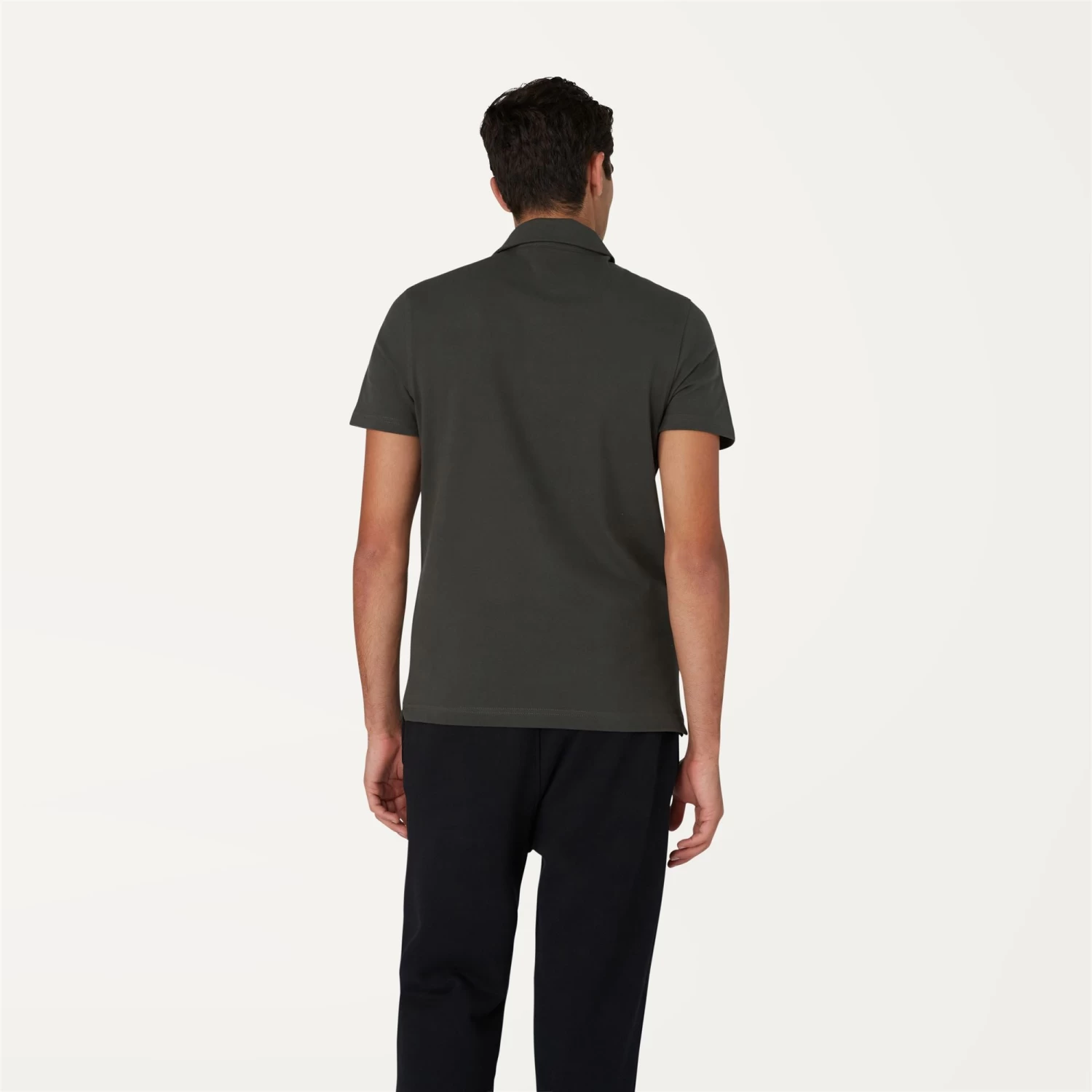 stretch fabric. The neck features a sweat-proof strip. Mother of pearl buttons