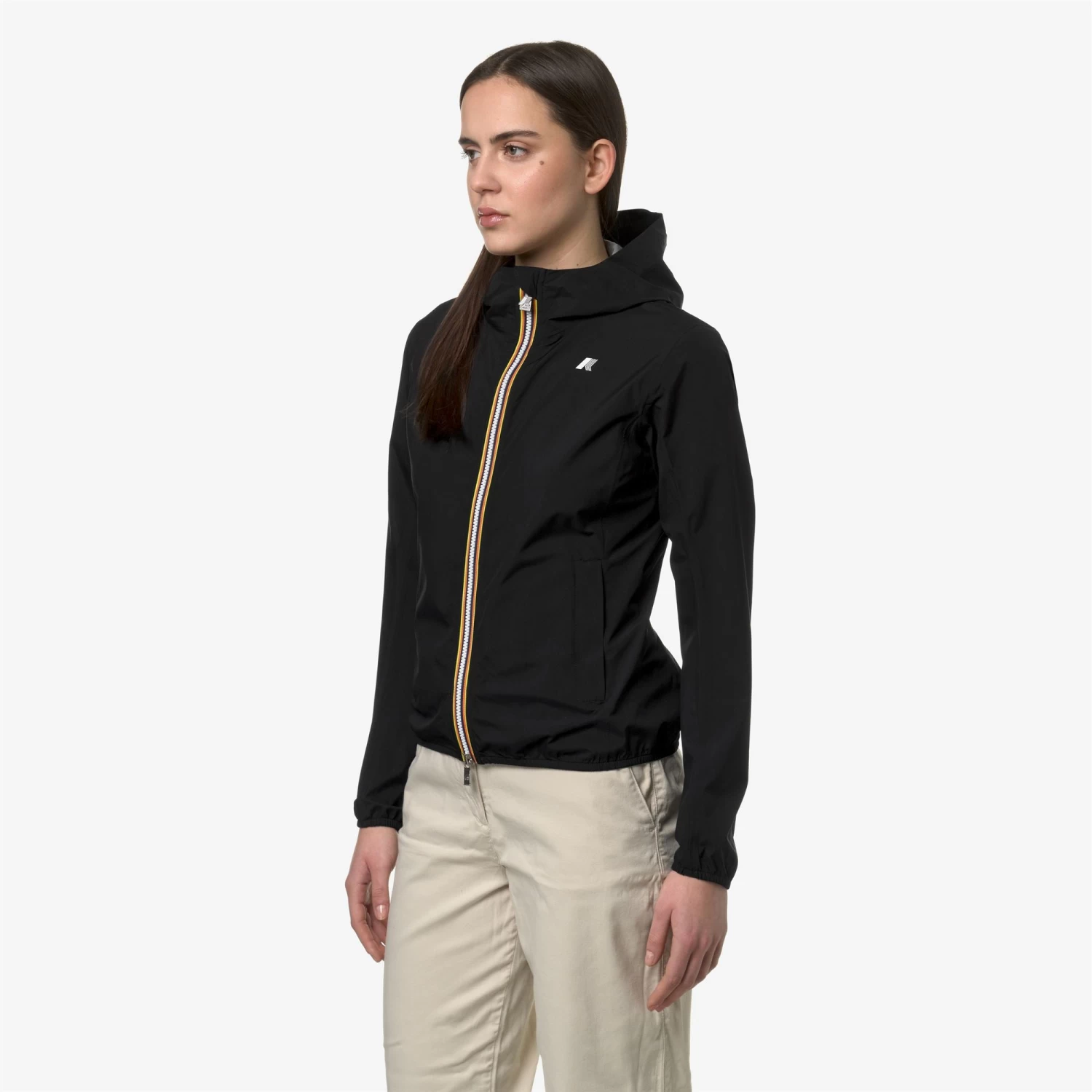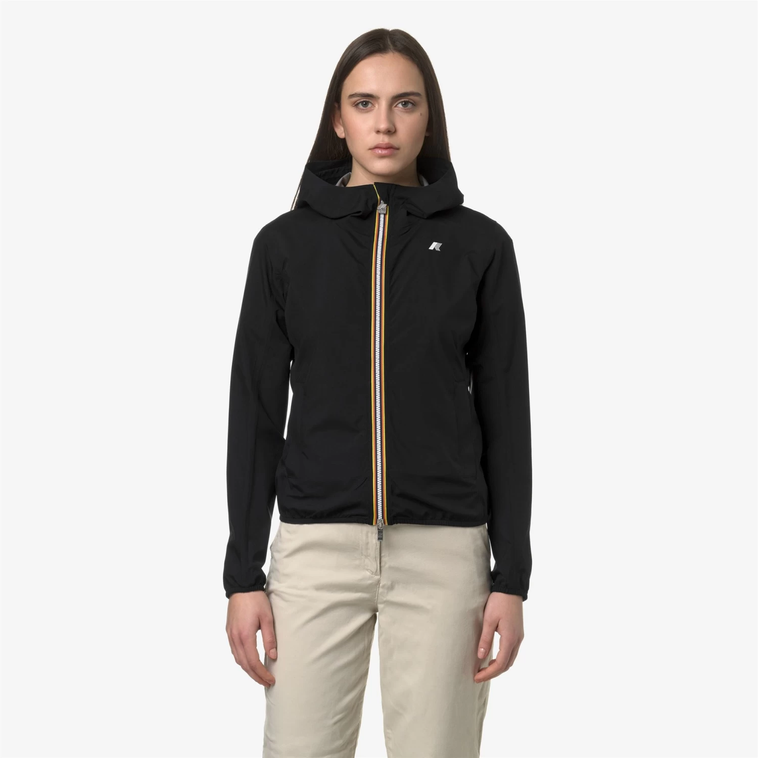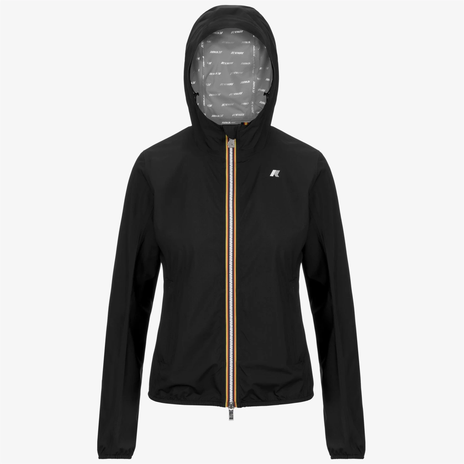 Lily is a women’s short jacket, perfect for transitional seasons, with a slim fit. It’s crafted from recycled and stretch technical fabric that allows freedom of movement while providing protection against wind and rain, with water resistance up to 10000mm. The interior is lined with an insulating membrane adorned with silver-tone K-Way lettering printed all over. Functional details such as side pockets with zippers, a wrap-around hood, cuffs, and hems with elastic inserts ensure a secure and comfortable fit for easy wear.