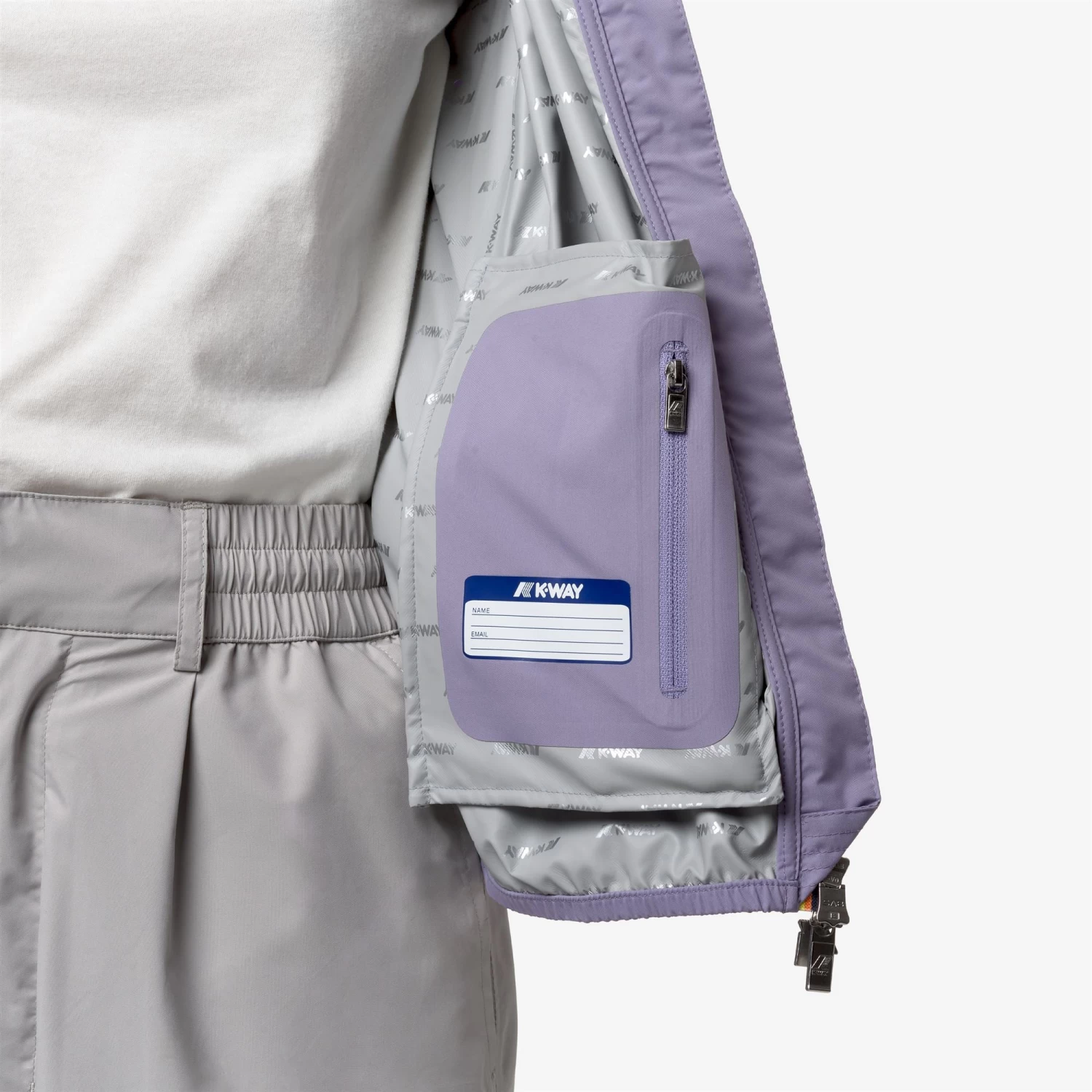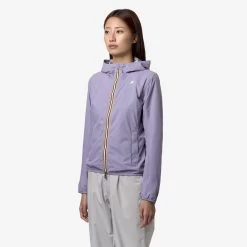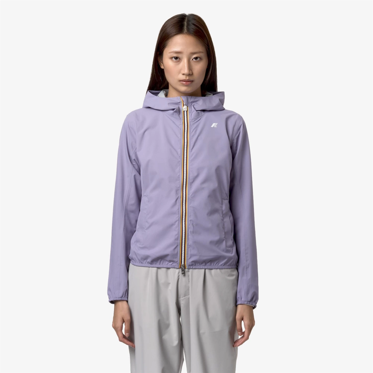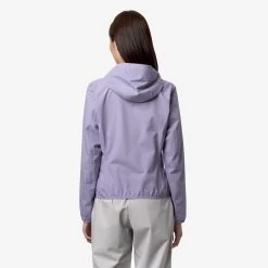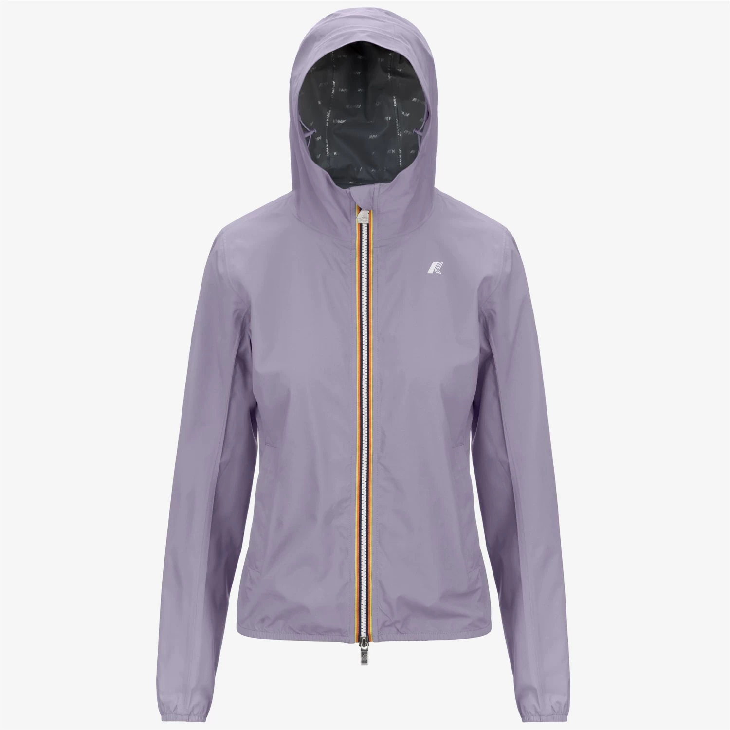 Lily is a women’s short jacket, perfect for transitional seasons, with a slim fit. It’s crafted from recycled and stretch technical fabric that allows freedom of movement while providing protection against wind and rain, with water resistance up to 10000mm. The interior is lined with an insulating membrane adorned with silver-tone K-Way lettering printed all over. Functional details such as side pockets with zippers, a wrap-around hood, cuffs, and hems with elastic inserts ensure a secure and comfortable fit for easy wear.
