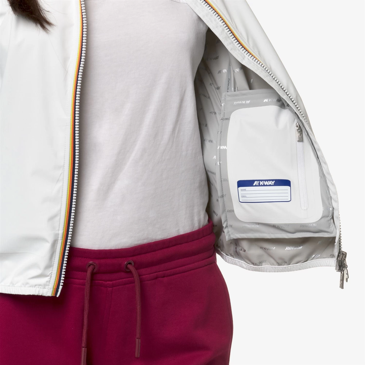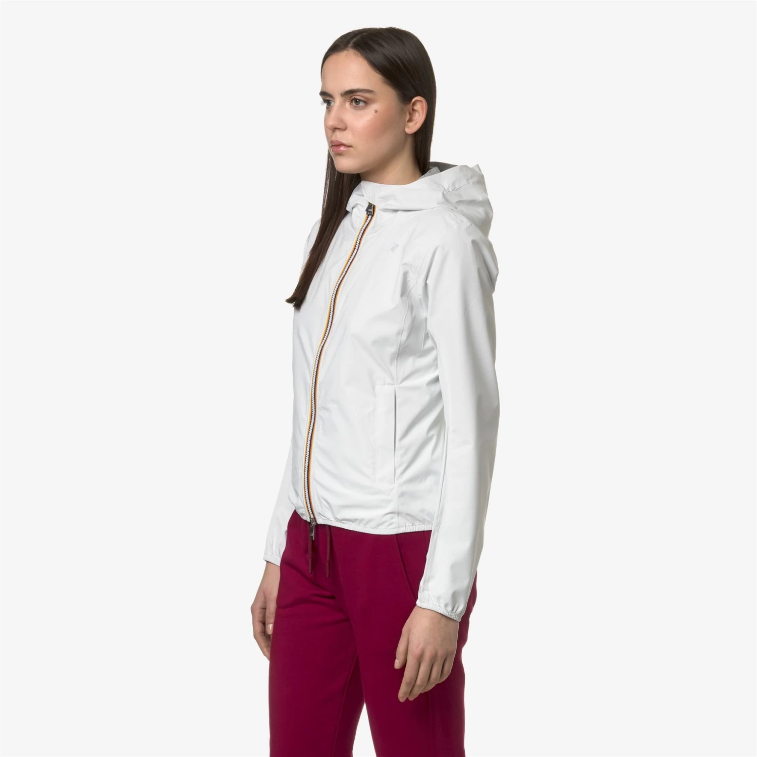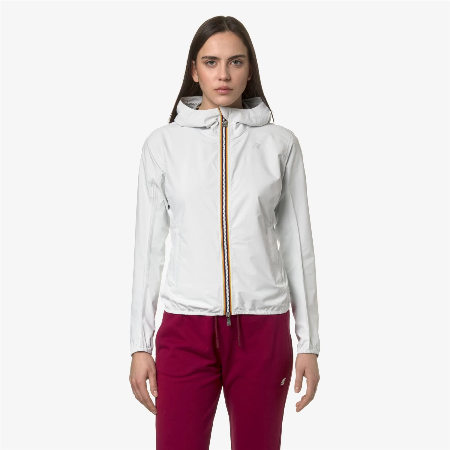 Lily is a women’s short jacket, perfect for transitional seasons, with a slim fit. It’s crafted from recycled and stretch technical fabric that allows freedom of movement while providing protection against wind and rain, with water resistance up to 10000mm. The interior is lined with an insulating membrane adorned with silver-tone K-Way lettering printed all over. Functional details such as side pockets with zippers, a wrap-around hood, cuffs, and hems with elastic inserts ensure a secure and comfortable fit for easy wear.