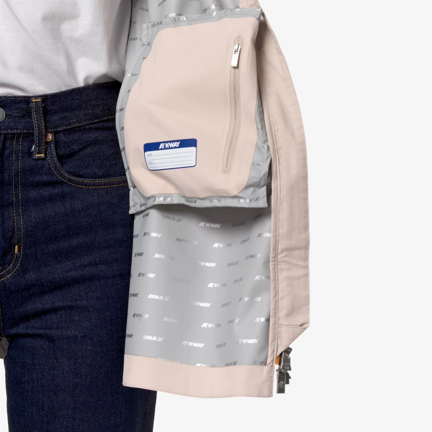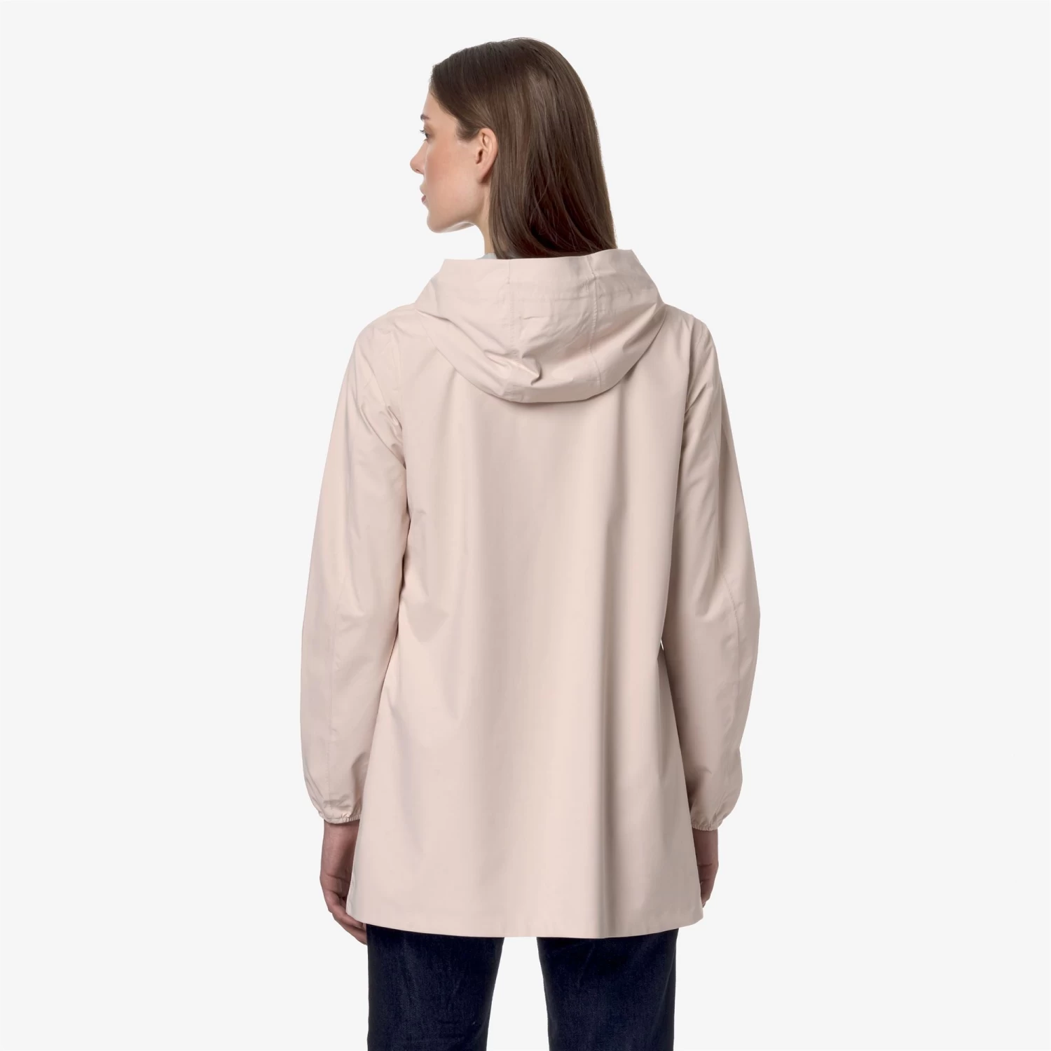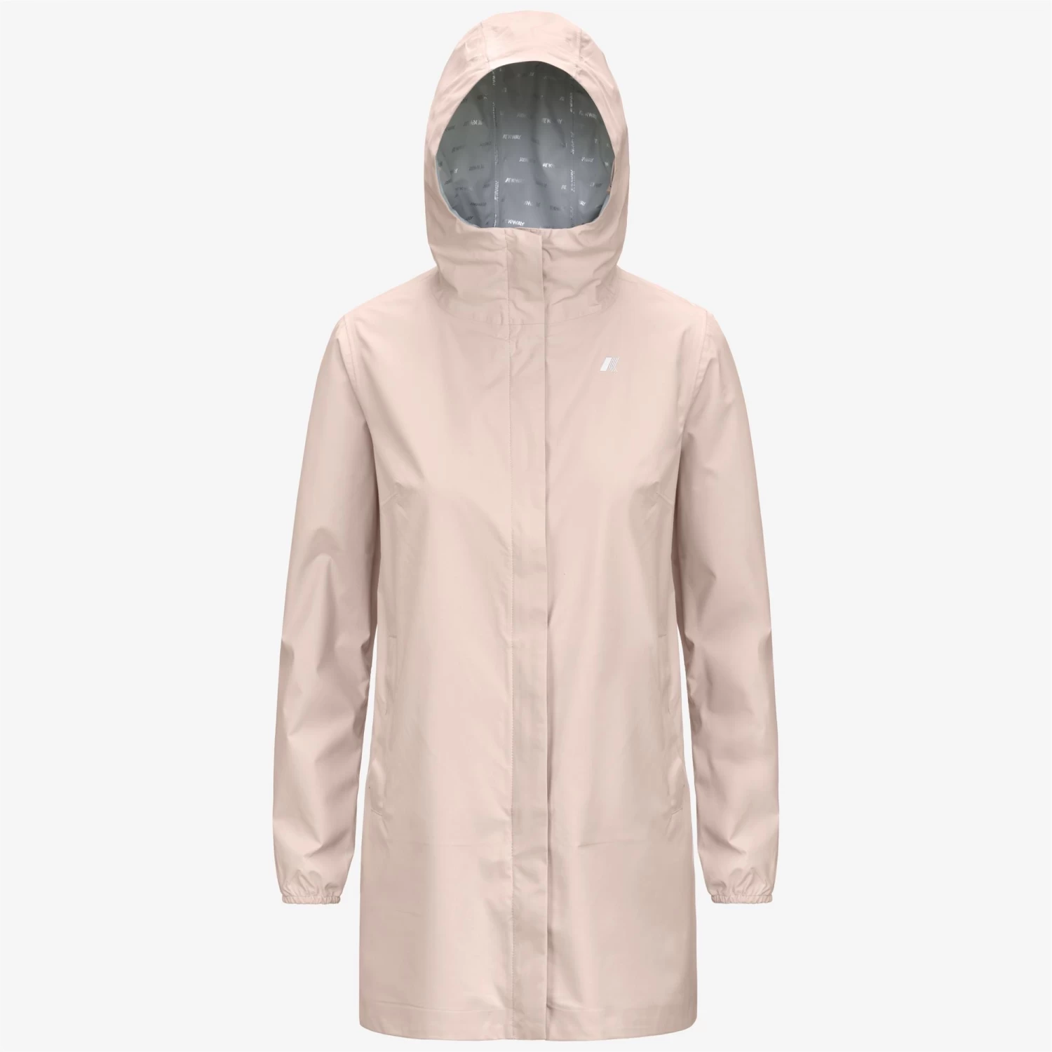 Sophie is a women’s three-quarter length jacket characterised by a slim fit that contours the silhouette. Made from recycled stretch fabric that offers protection against wind and rain, with water resistance up to 5000mm, its design is enhanced with an insulating inner membrane, printed with all-over silver K-Way lettering. A drawstring hood and elasticated cuffs add a functional touch for a practical and versatile garment, perfect for outdoor activities.